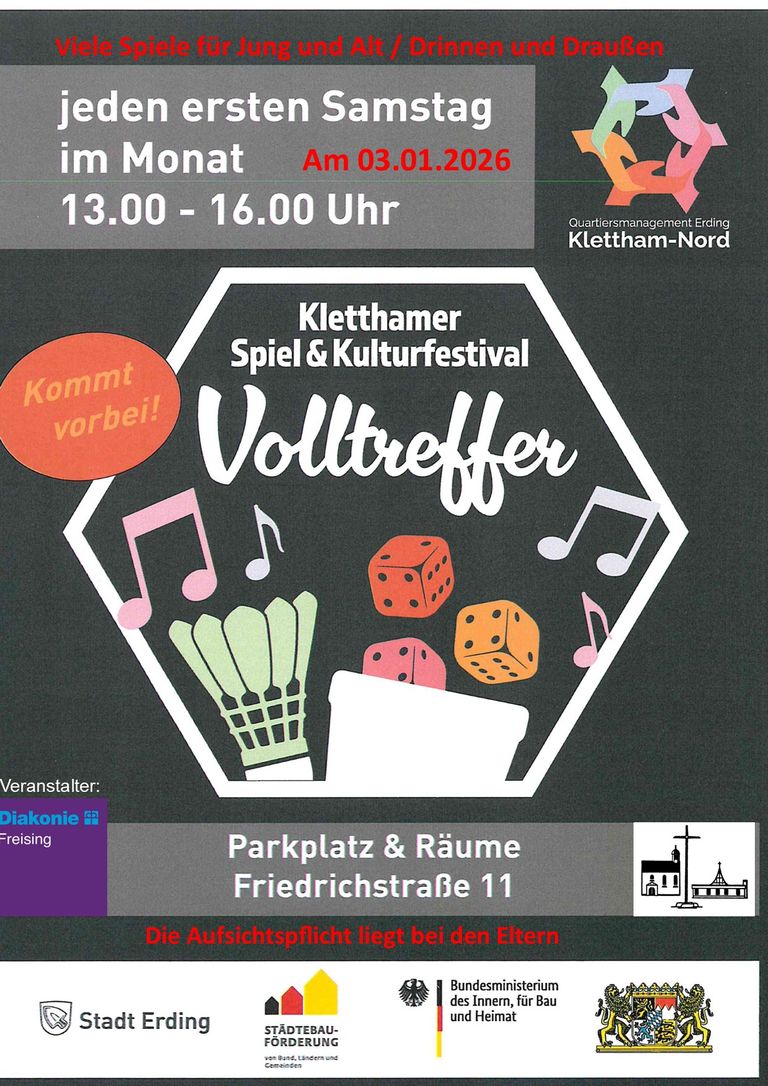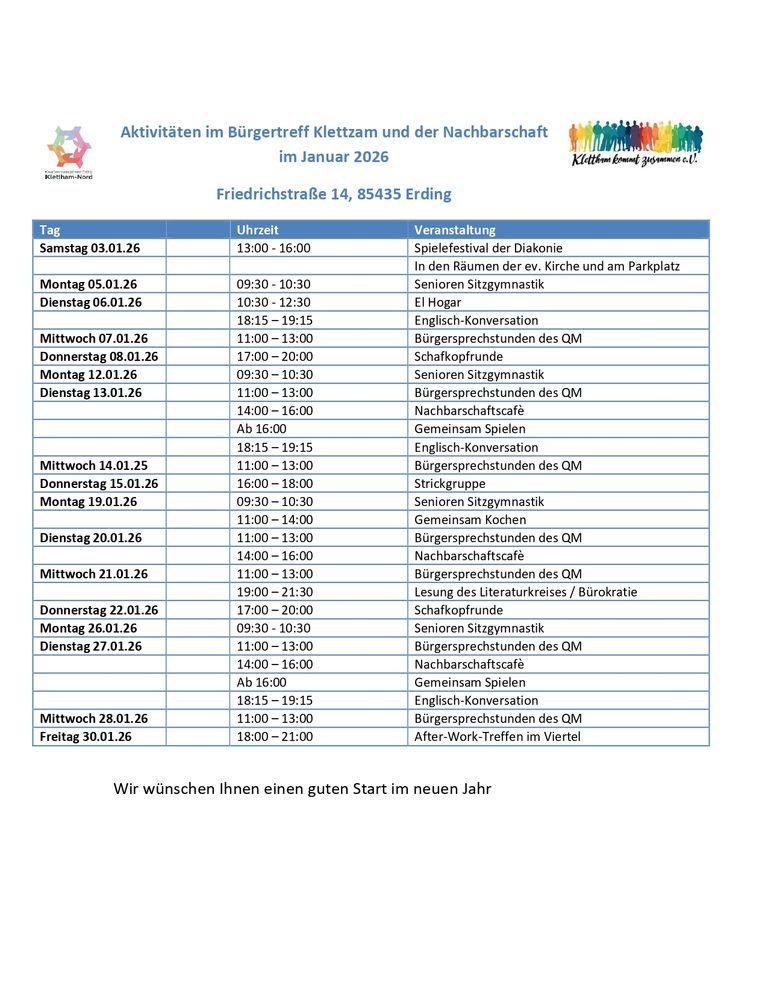 Die Stadt Erding hat im September 2024 das Bürgertreff Klettzam eröffnet und die Nutzung der Räumlichkeiten des Quartiersmanagement Klettham – Nord und dem Verein Klettham kommt zusammen übertragen.