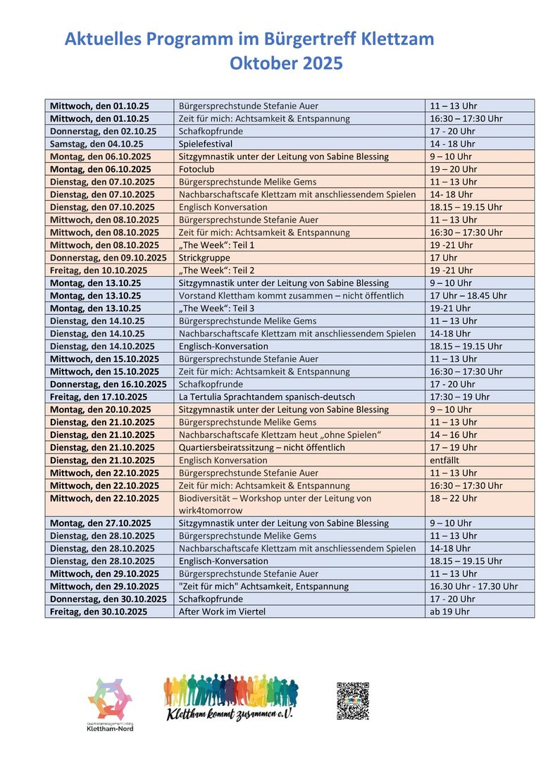 eine Gruppe von Kletthamer Bürgern hat im Juli 2024 den gemeinnützigen Verein „Klettham kommt zusammen e.V.“ gegründet. Die Gruppe hat sich im Rahmen der Aktivitäten des Quartiersmanagements Klettham Nord (www.qm-klettham-nord.de) gefunden.